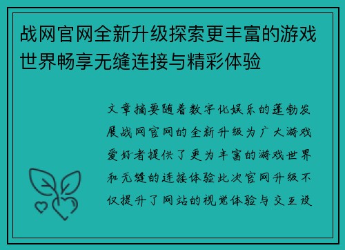 在数字化娱乐的时代,游戏已经成为了许多人日常生活的重要组成部分。随着游戏种类日益丰富,如何在繁多的选择中找到合适的游戏,成为了玩家关注的焦点。好游戏世界下载平台正是这样一个为玩家提供多样化游戏资源、畅玩无忧、极速体验的理想平台。本文将从四个方面对好游戏世界下载平台的优势进行深入探讨,包括丰富的游戏资...